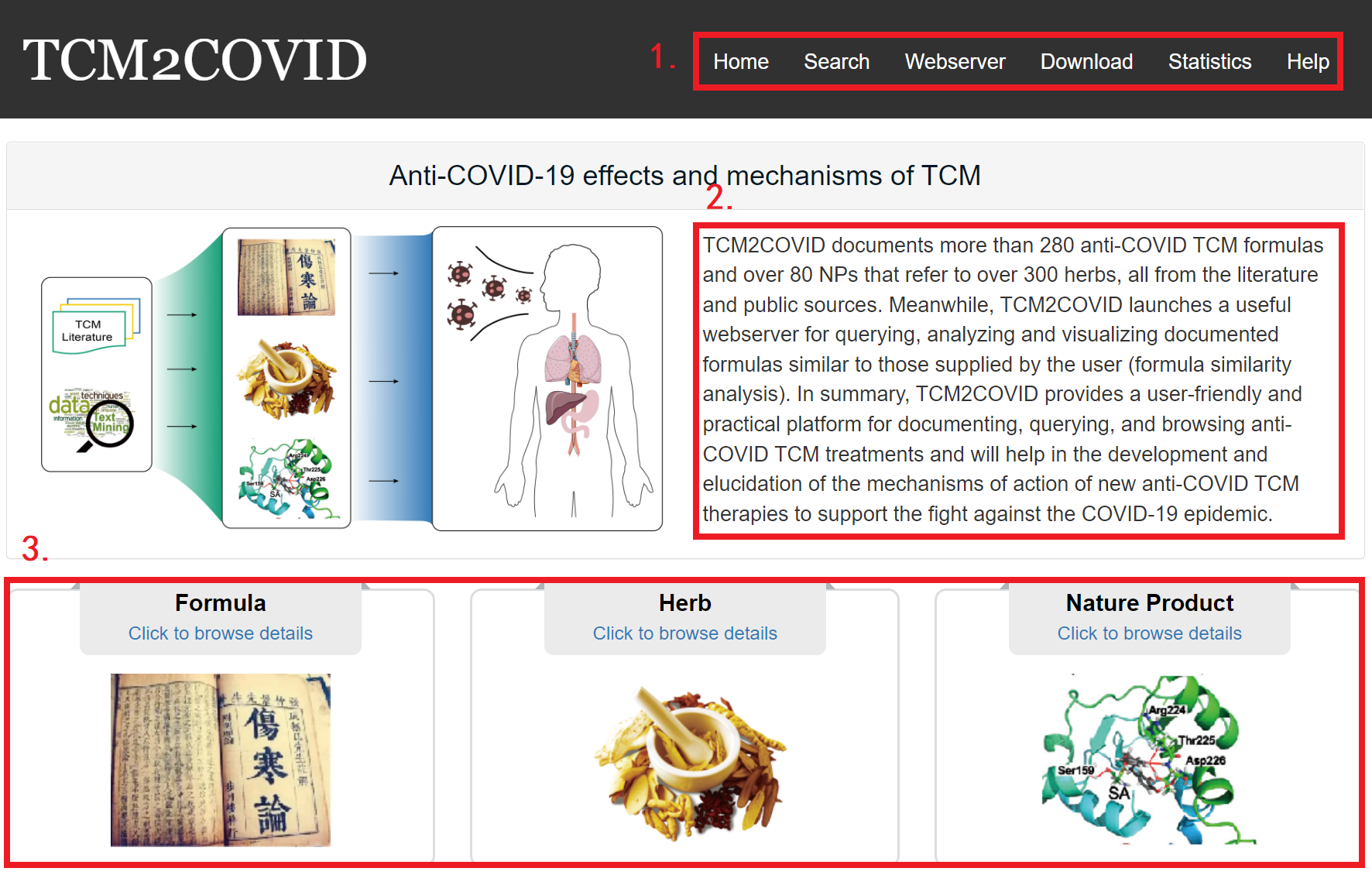 TCM2COVID documents more than 280 anti-COVID TCM formulas and over 80 NPs that refer to over 300 herbs, all from the literature and public sources. Meanwhile, TCM2COVID launches a useful webserver for querying, analyzing and visualizing documented formulas similar to those supplied by the user (formula similarity analysis). In summary, TCM2COVID provides a user-friendly and practical platform for documenting, querying, and browsing anti-COVID TCM treatments and will help in the development and elucidation of the mechanisms of action of new anti-COVID TCM therapies to support the fight against the COVID-19 epidemic.