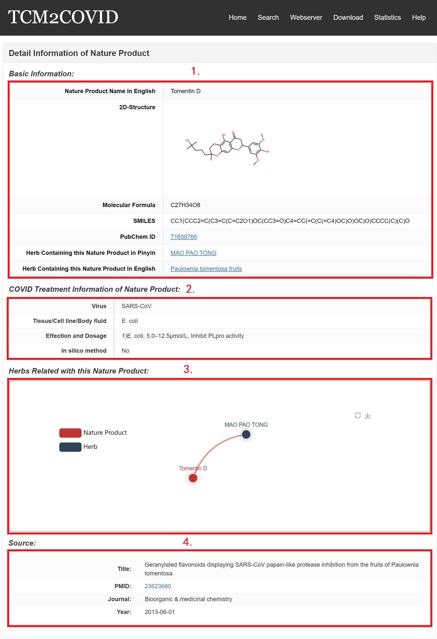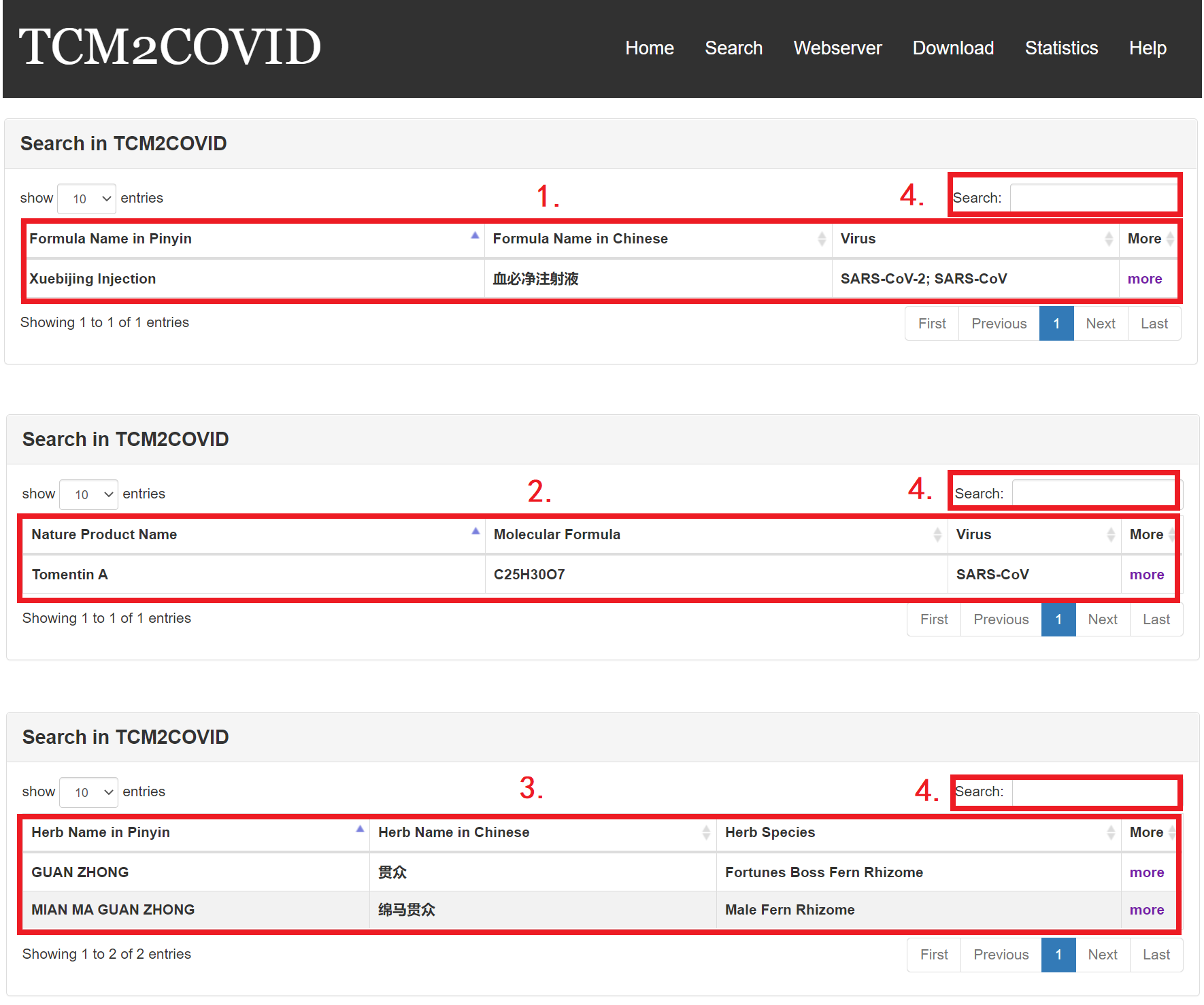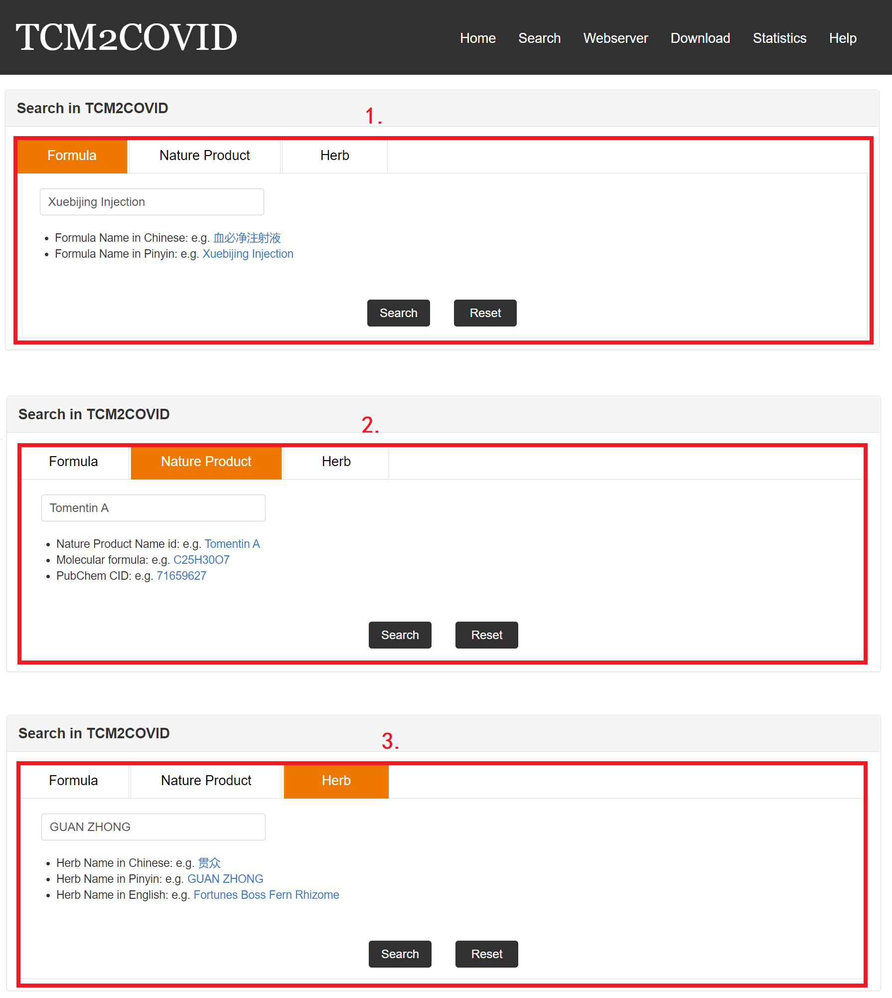 3. Herb Search: users can enter an herb Chinese name/Pinyin name/English name to search herbs related to anti-COVID formulas and NPs.