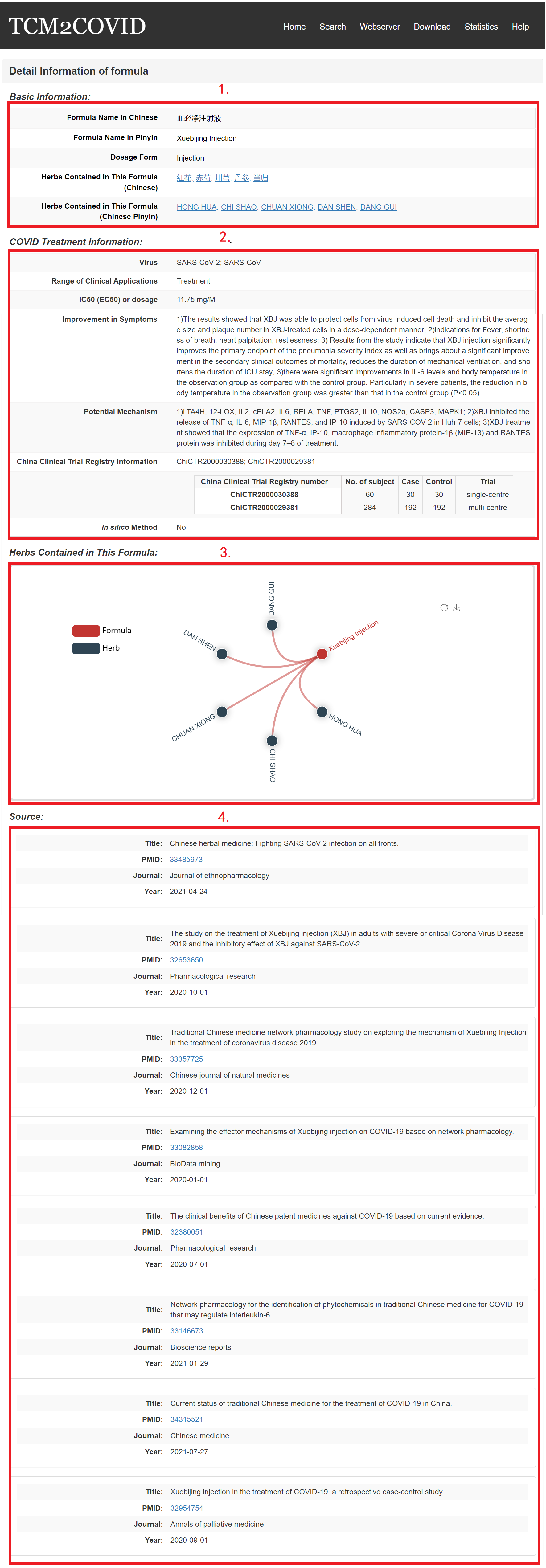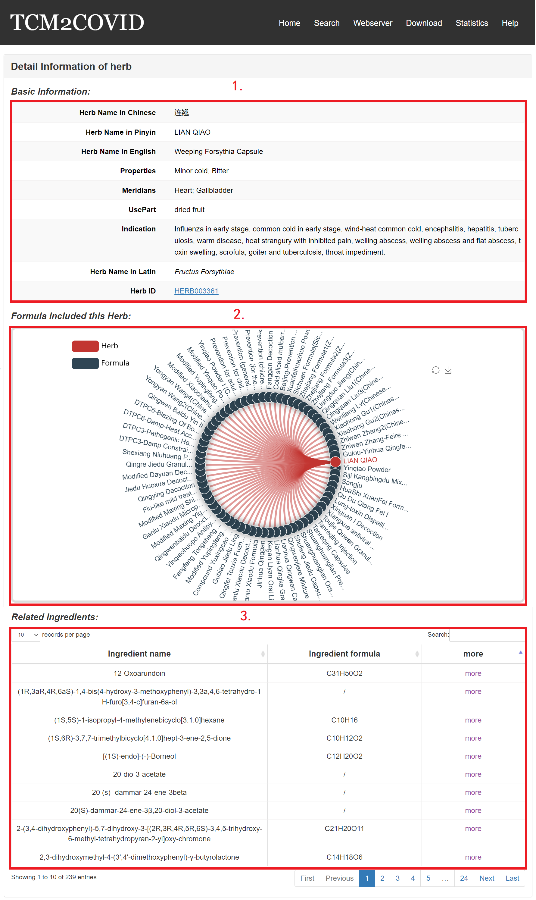 1. Basic Information: including herb Chinese name, Pinyin name, English name, Latin name, properties, meridians and indication and HERB id.